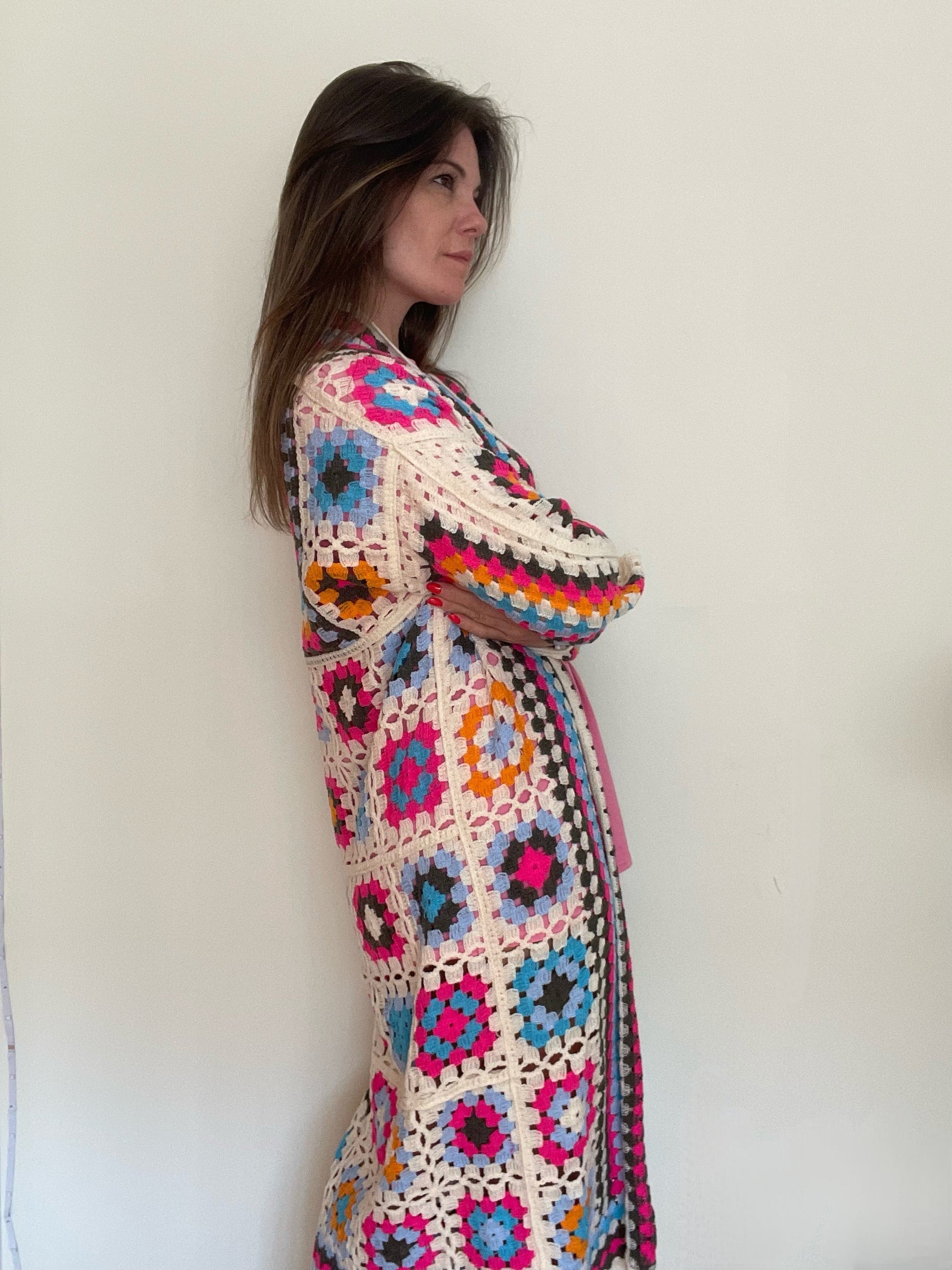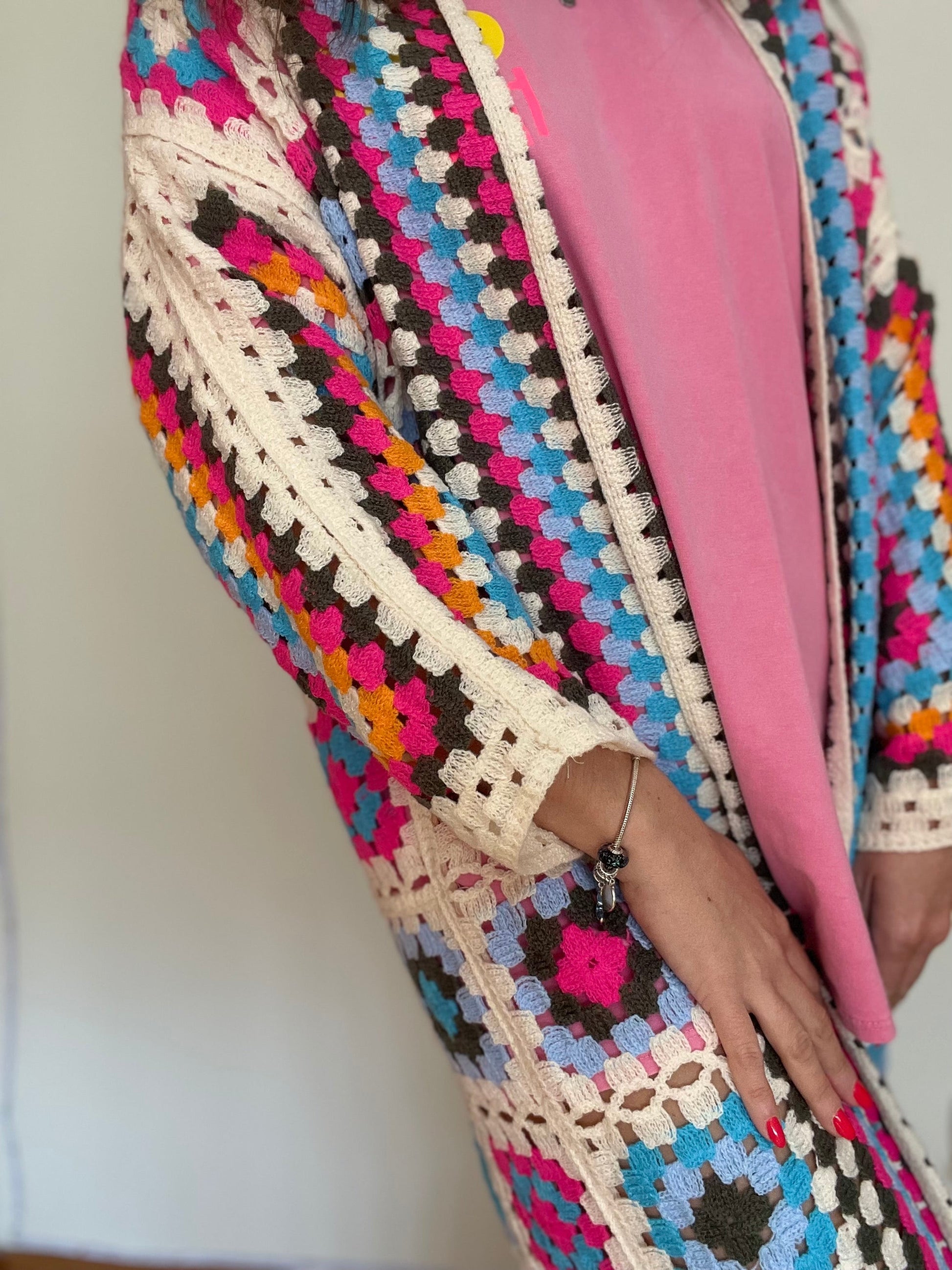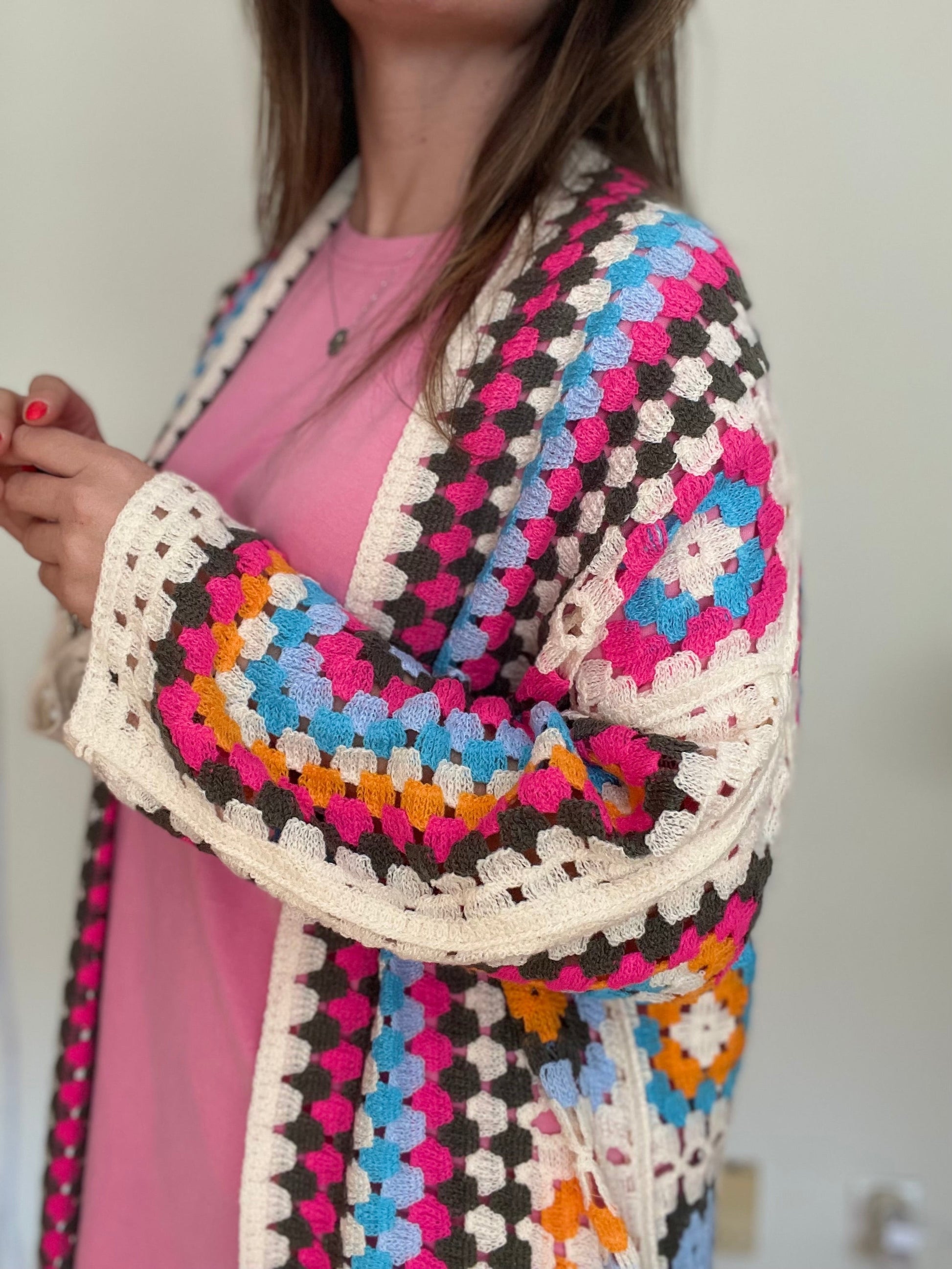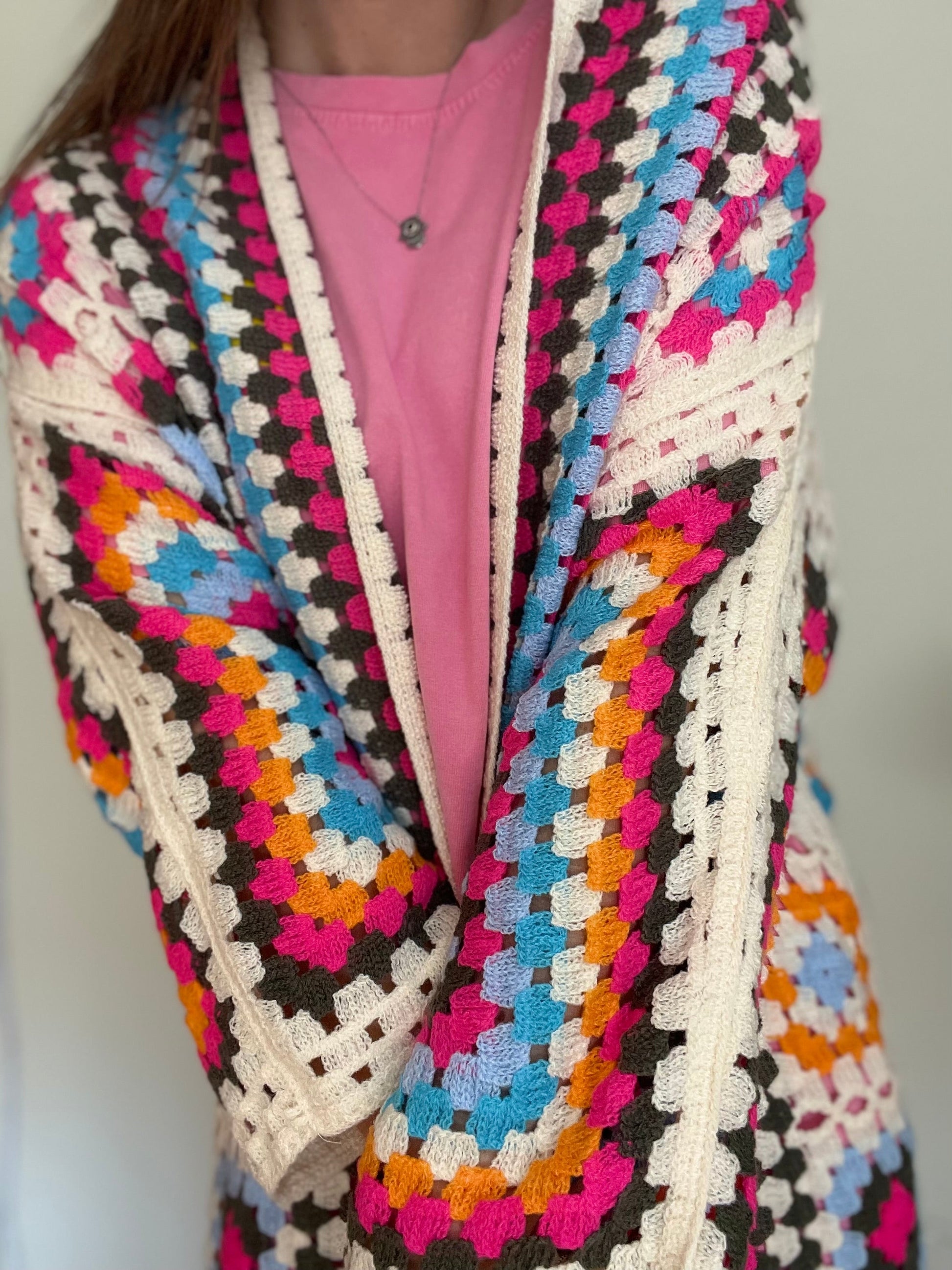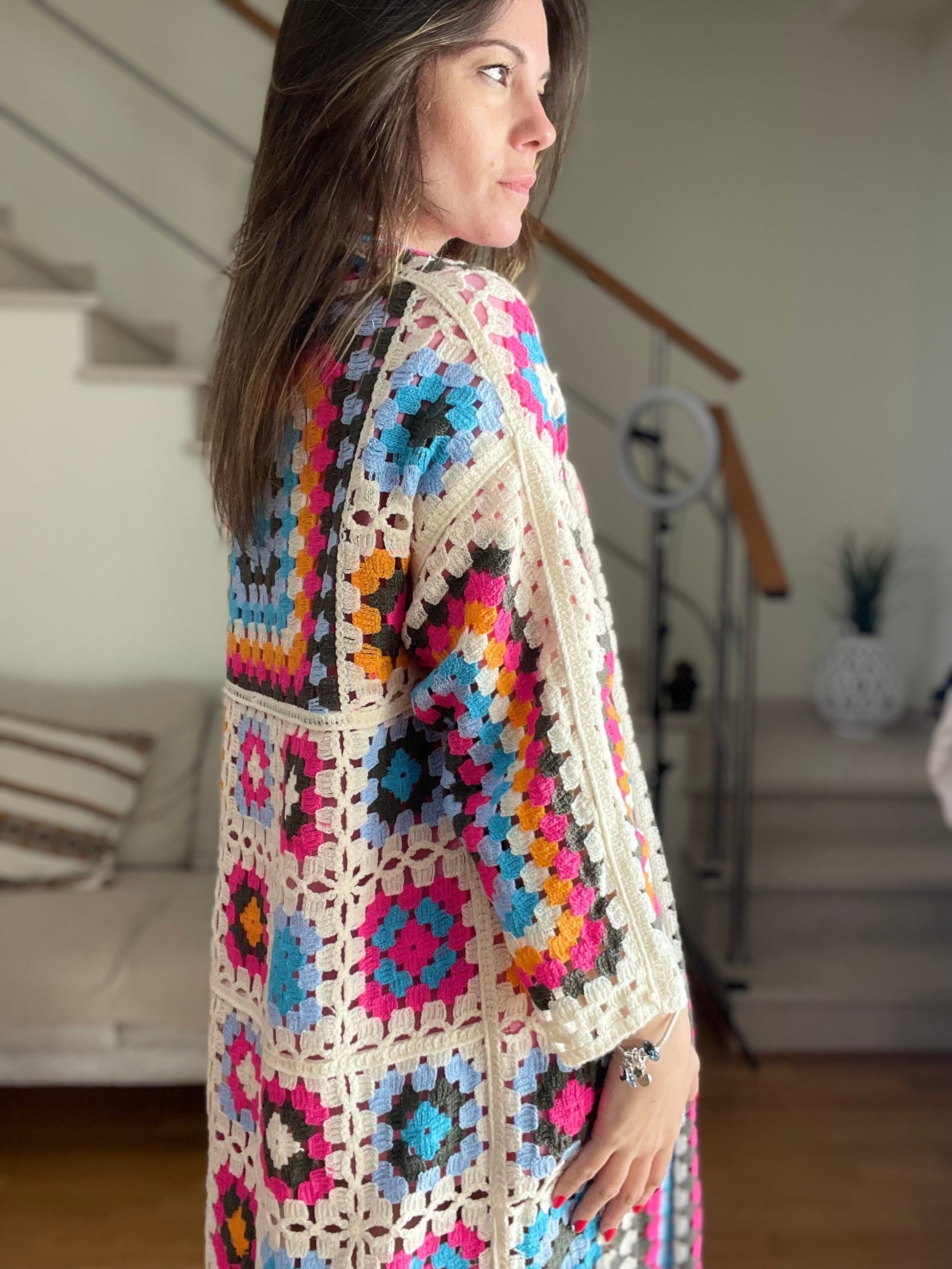 O clássico ponto granny reinventado num kimono cheio de cor, personalidade e alma boho! Feito em croché artesanal com padrão geométrico vibrante, é aquele toque único que transforma qualquer look básico num visual de verão memorável.