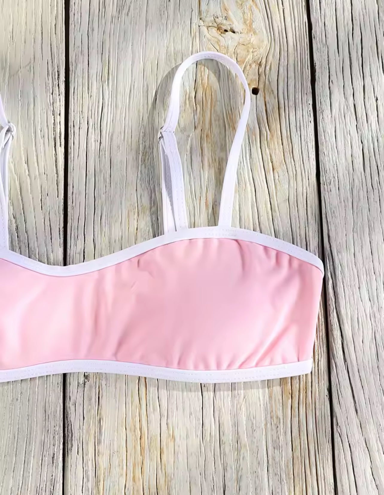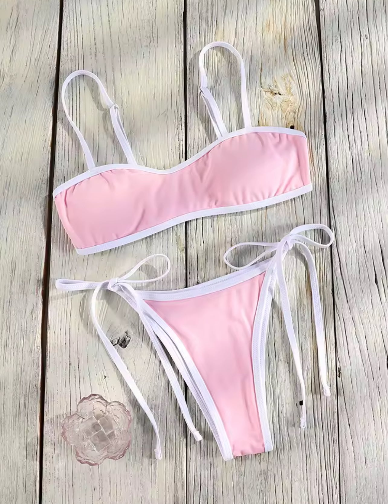 O biquíni Capri é perfeito para quem adora um visual delicado e feminino sem abdicar do conforto. Em rosa claro com rebordo branco, este conjunto transmite frescura e romantismo, ideal para relaxar à beira-mar ou junto à piscina.