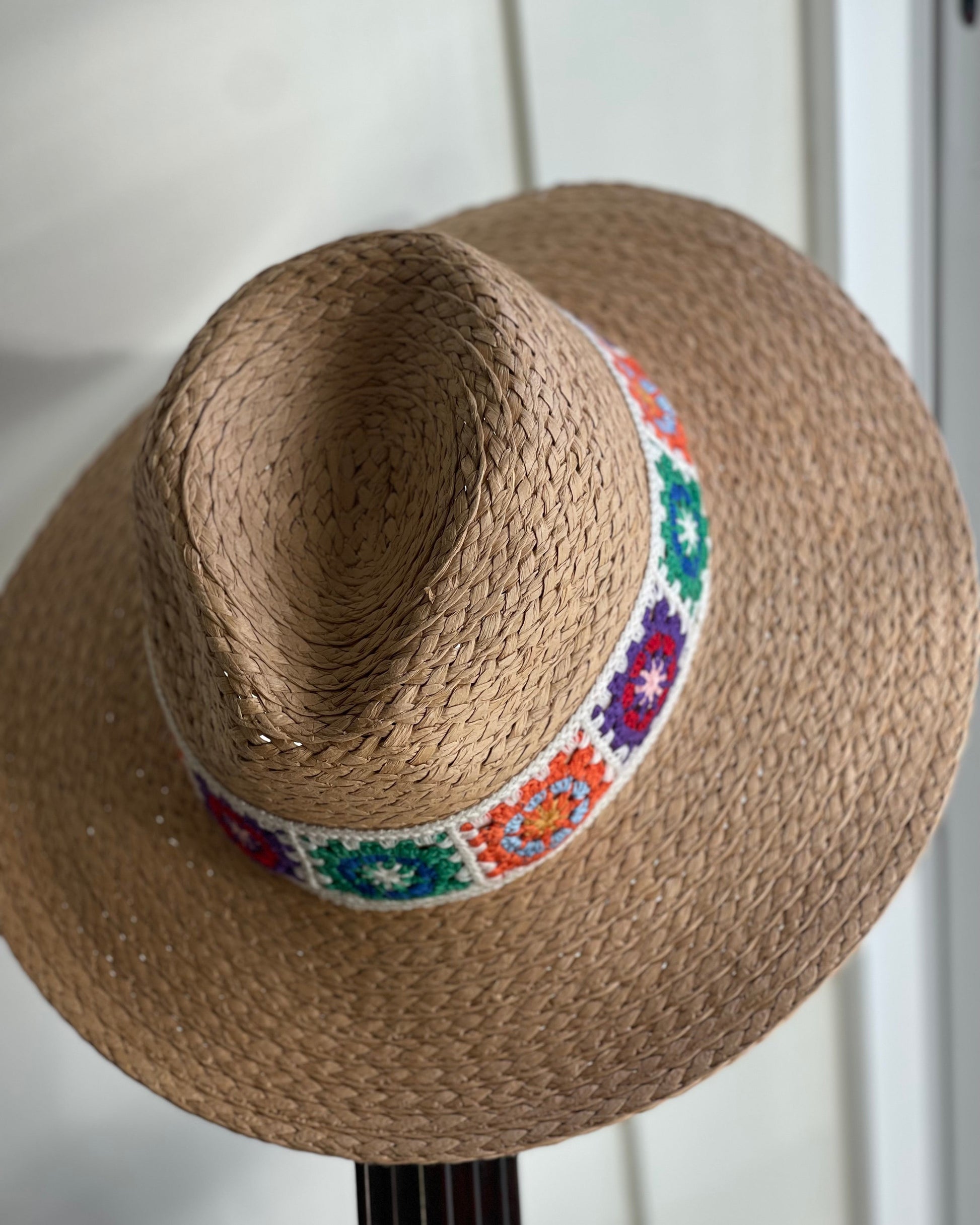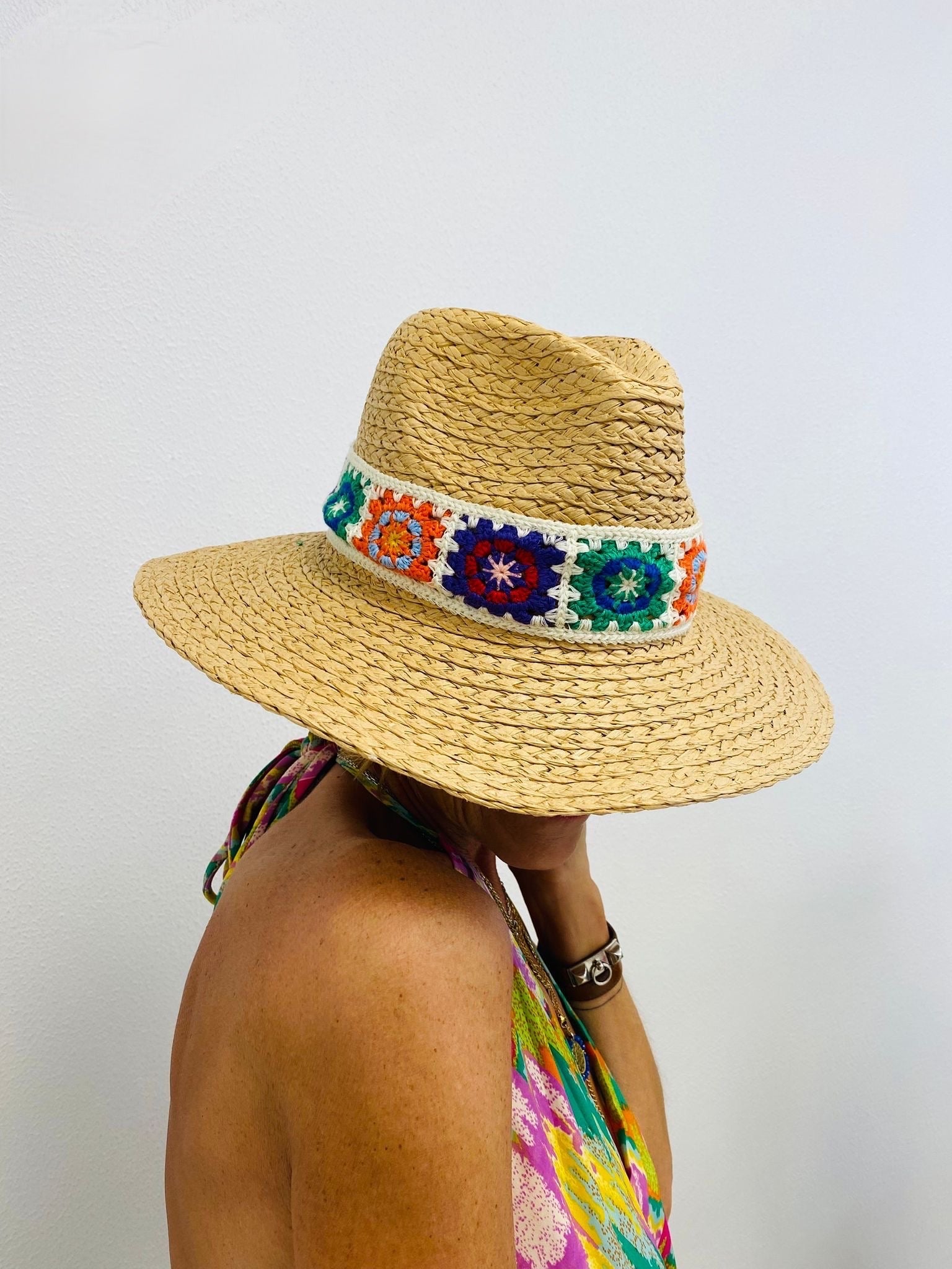 O acessório indispensável para os dias de sol! Este chapéu de palha natural combina proteção e estilo, com uma faixa em croché colorido a toda a volta que dá um toque boho e alegre ao look. Perfeito para a praia, piscina ou para completar qualquer outfit de verão. Tamanho único, confortável e leve — um clássico de verão com um twist artesanal.