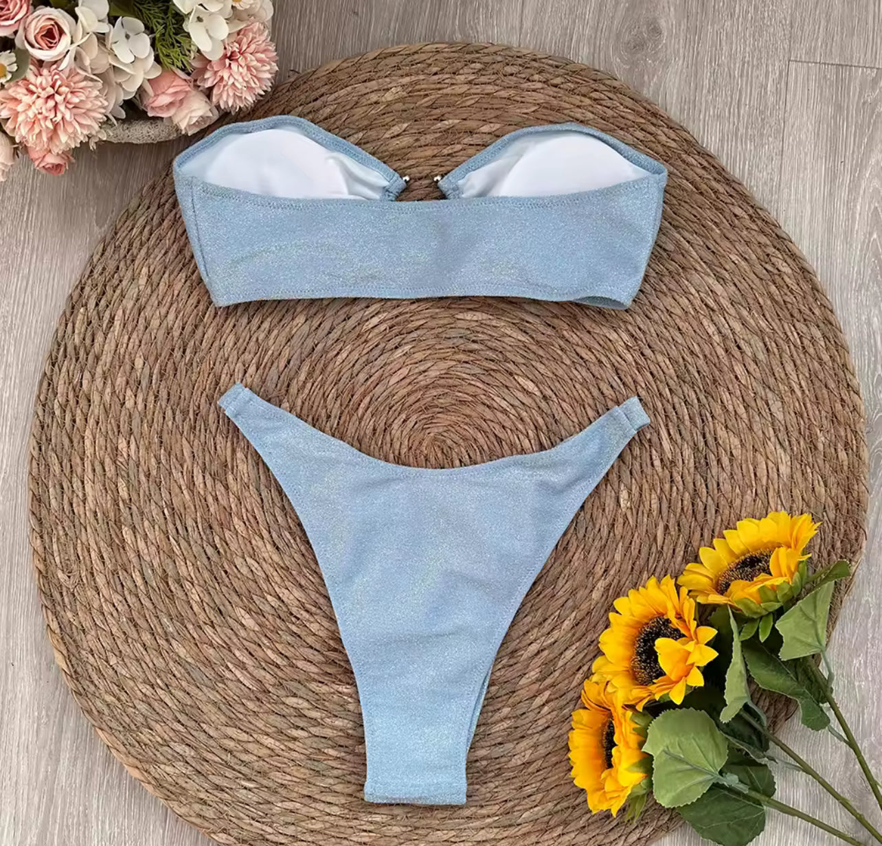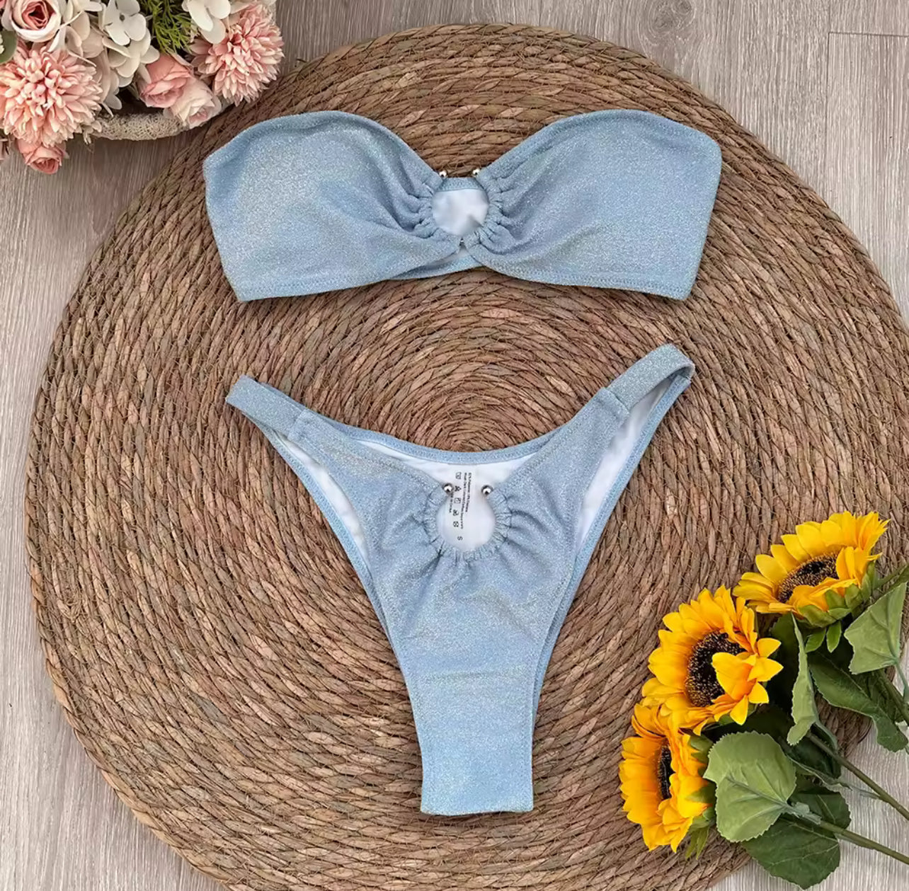 Destaque-se com o glamour discreto e sofisticado do biquíni Ocean. Confecionado em tecido com brilho subtil e acabamento de alta qualidade, este modelo apresenta um top estilo faixa com aro central e uma cueca de cintura subida, estilo asa-delta, com detalhe em argola metálica. Um design minimalista e elegante que realça a silhueta e garante um visual moderno e arrojado para os dias de verão.