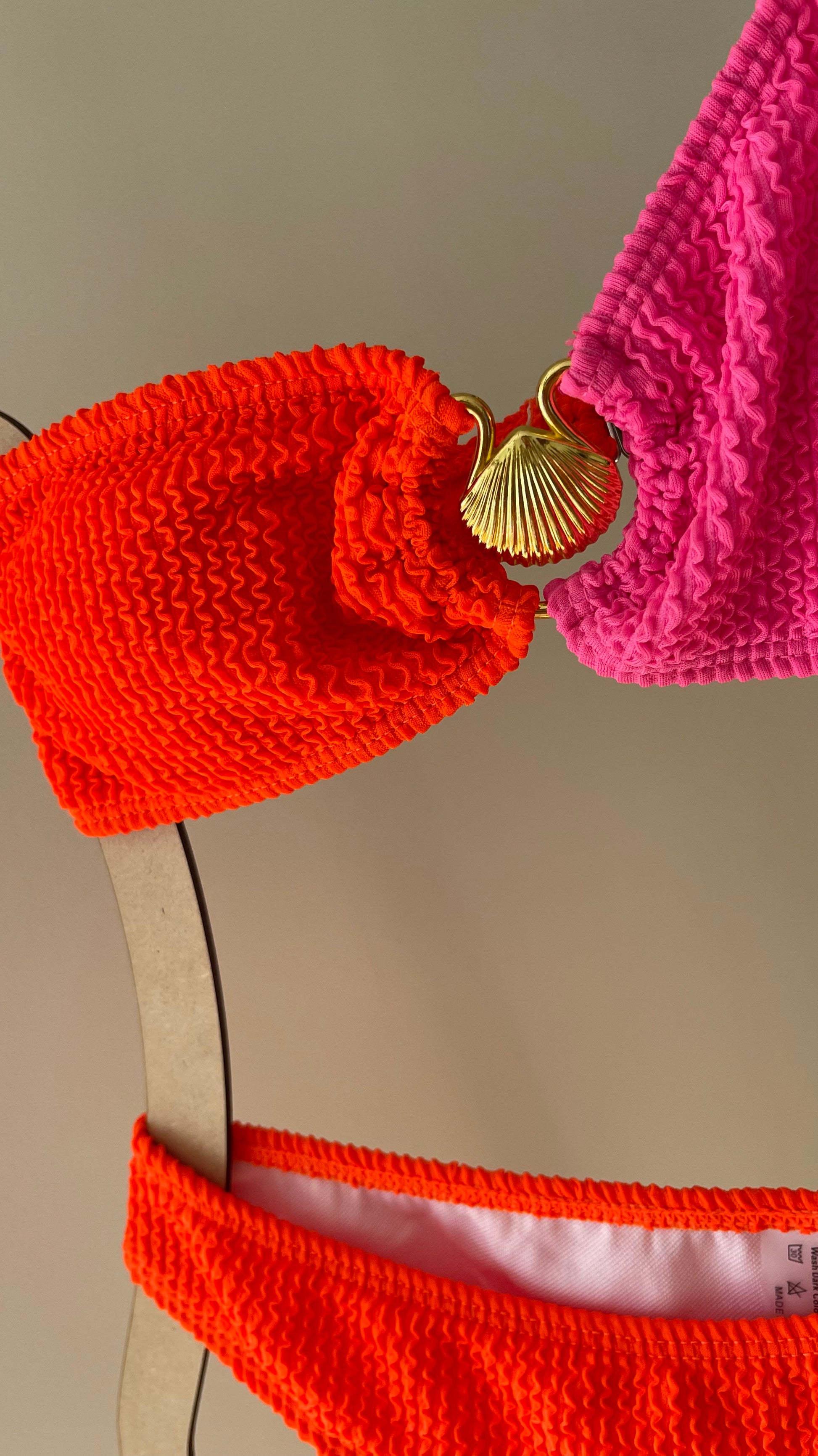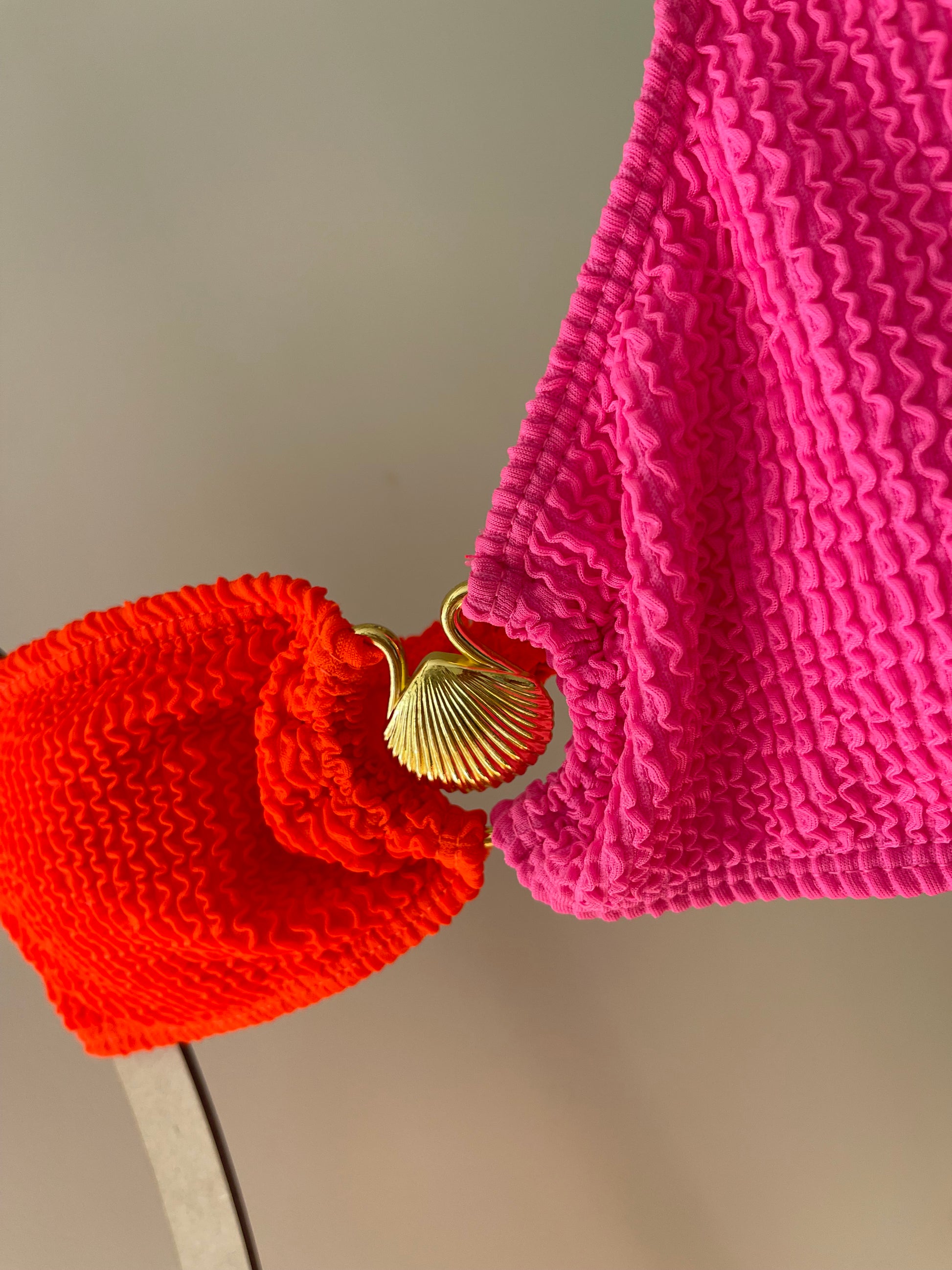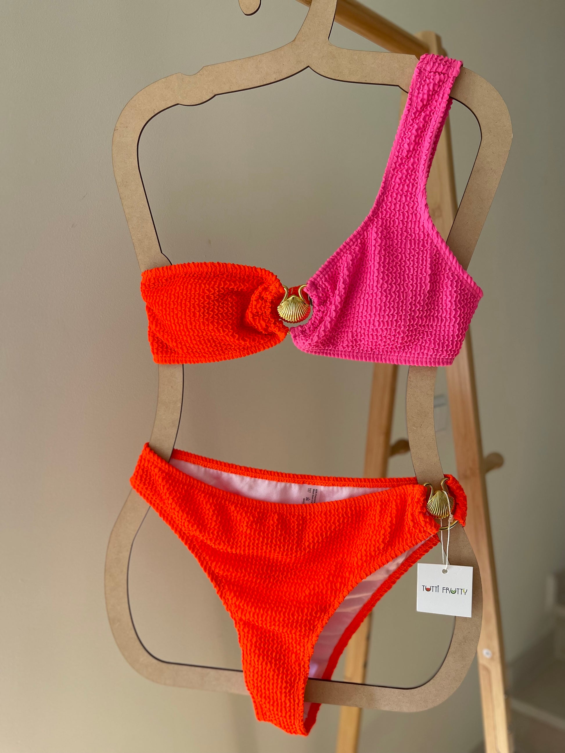 Top assimétrico só com uma alça, com aplique de concha dourada, almofadas removíveis.
